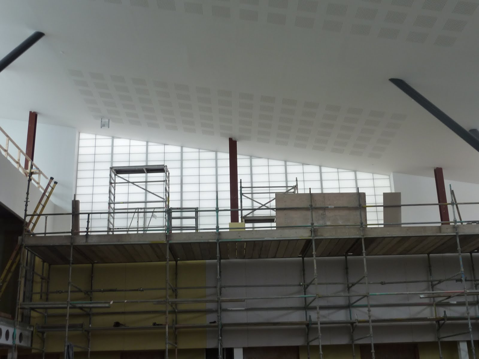 Much of the work over the past month has been on the installation of the main atrium ceiling. 135 tonnes of scaffolding were required to create a platform for construction staff to work from. 500 sheets of plasterboard have been screwed to a steel grid hanging from the roof. Everything had to be carried in by hand! Most commented that it was the biggest ceiling they had ever worked on.